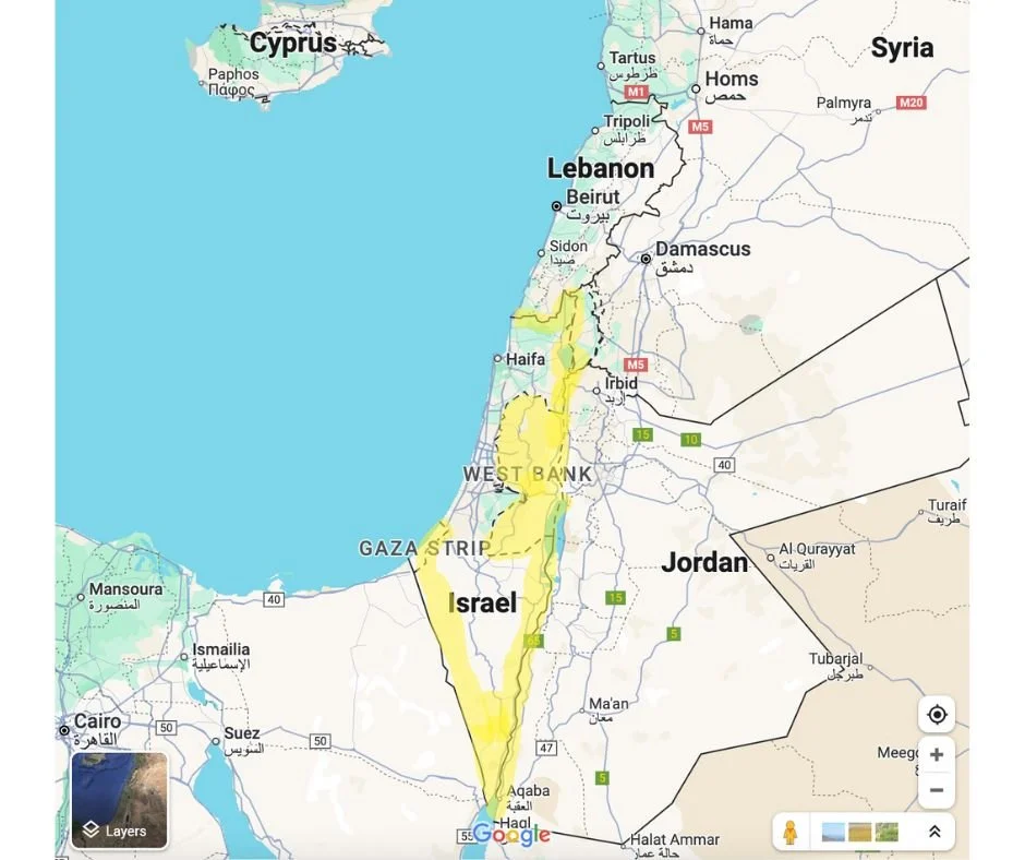New Palestinian State highlighted in yellow; Sourced from Google Maps;