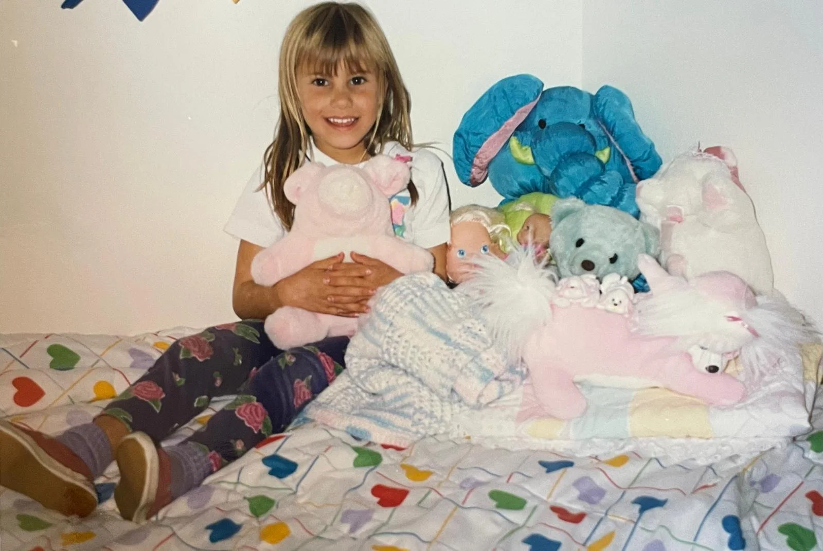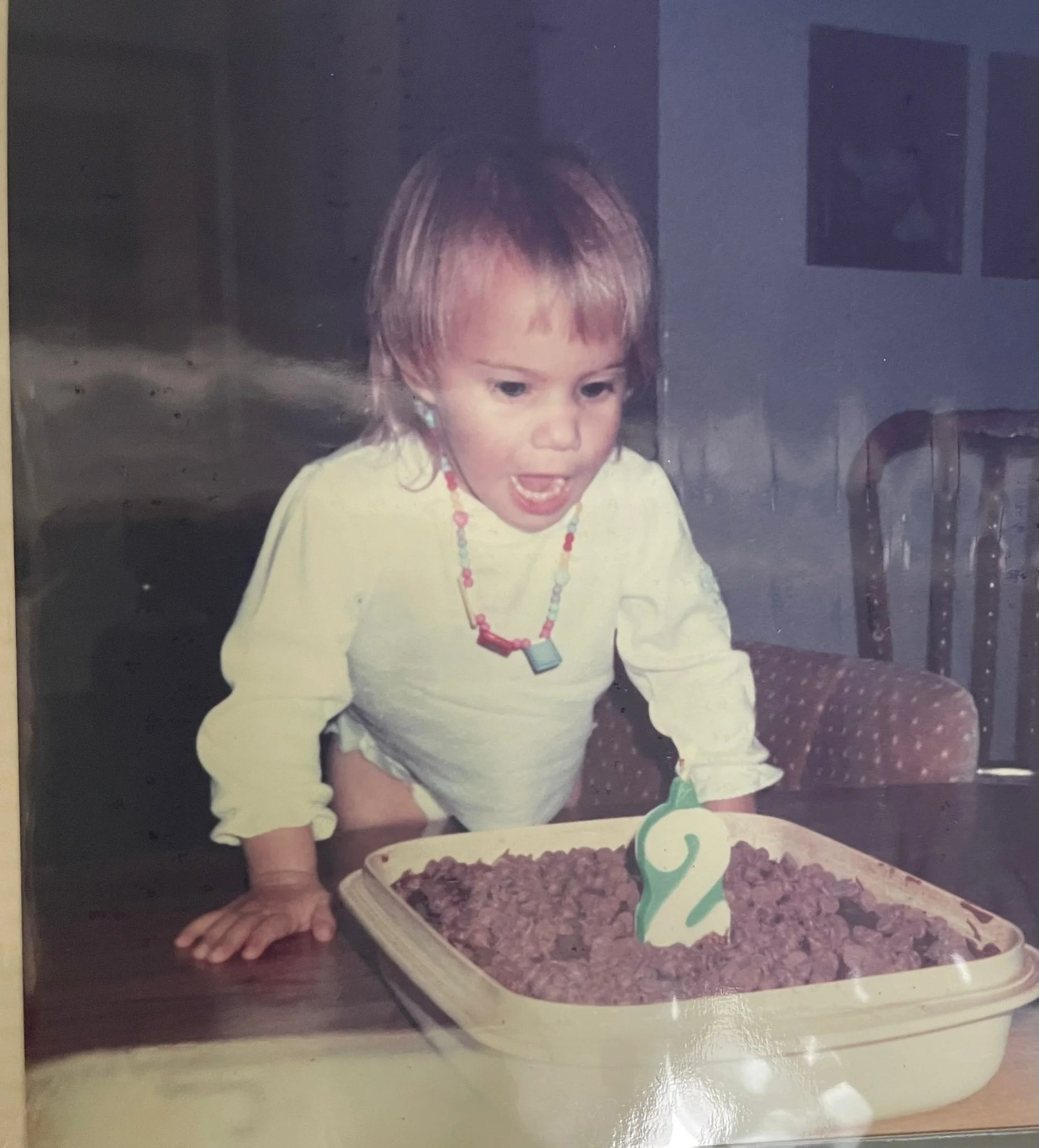 A little older. Brown hair (I may have also used a crimper LOL :) with our little toy poodle our family and my mom’s parents (my grandparents) who lived nearby loved so dearly.