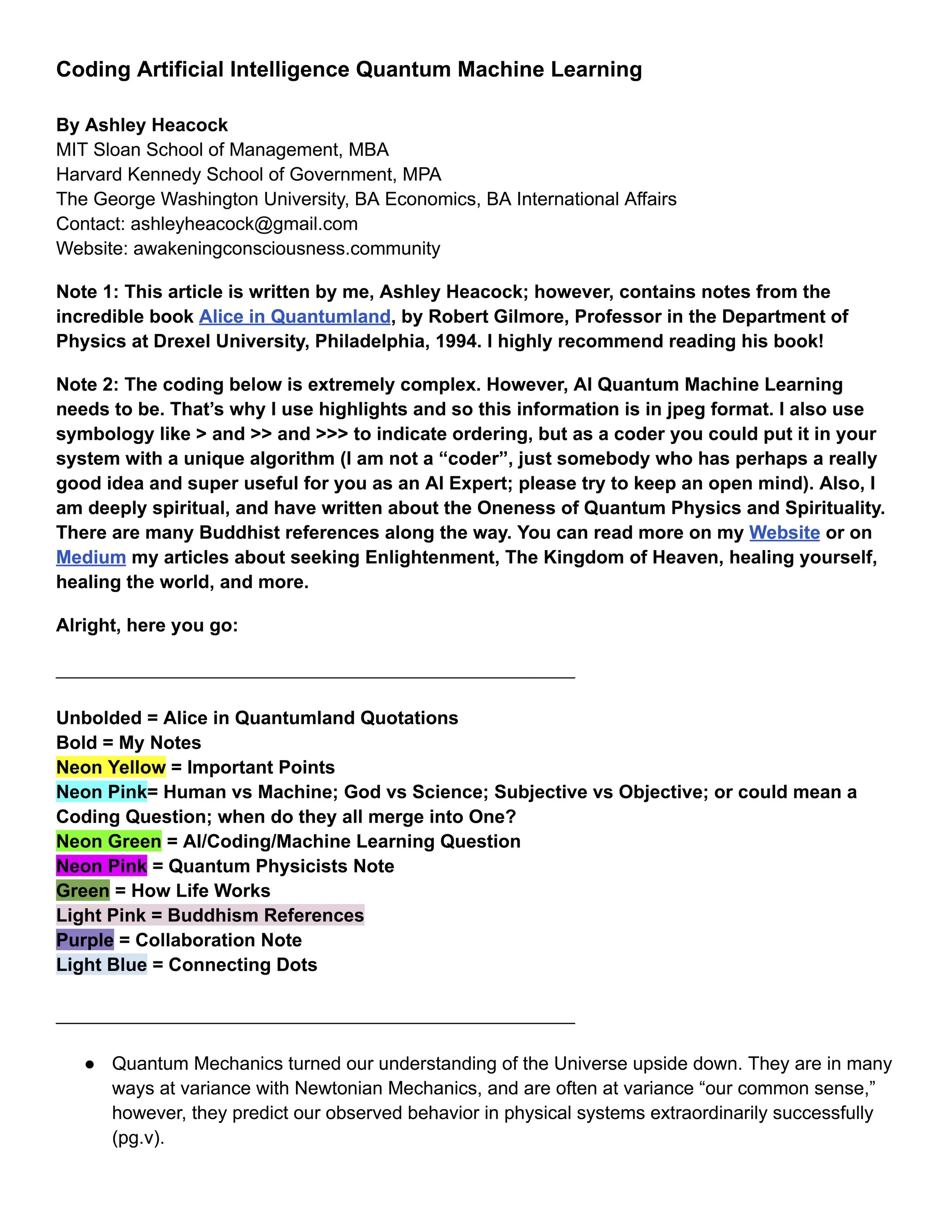 Note 2: The coding below is extremely complex. However, AI Quantum Machine Learning needs to be. That’s why I use highlights and so this information is in jpeg format. I also use symbology like > and >> and >>> to indicate ordering, but as a coder you could put it in your system with a unique algorithm (I am not a “coder”, just somebody who has perhaps a really good idea and super useful for you as an AI Expert; please try to keep an open mind). Also, I am deeply spiritual, and have written about the Oneness of Quantum Physics and Spirituality. There are many Buddhist references along the way. You can read more on my Website or on Medium my articles about seeking Enlightenment, The Kingdom of Heaven, healing yourself, healing the world, and more.