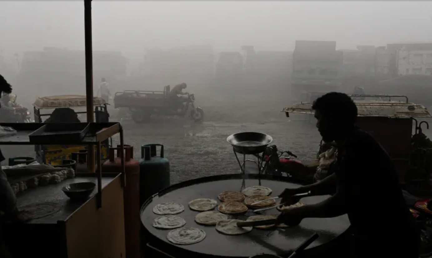 A labourer makes bread along a road amid heavy smog in Lahore [File: Arif Ali/AFP]